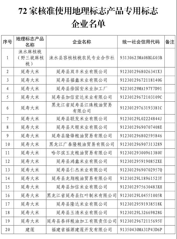 根据国务院《关于国务院机构改革涉及行政法规规定的行政机关职责调整问题的决定》,按照原国家质量监督检验检疫总局《地理标志产品保护规定》,生产涞水麻核桃(野三坡麻核桃)、延寿大米、建莲、建盏、福州茉莉花茶、增城丝苗米、罗定稻米、化橘红、马坝油粘米、麻江蓝莓、普安红茶、修文猕猴桃等12个产品的72家企业(名单见附件),分别向产品所在地相关部门提出了地理标志产品专用标志使用申请,经有关省级知识产权行政部门审核,并经国家知识产权局审查合格,现予以注册登记。自即日起核准上述企业在其生产的地理标志产品上使用地理标志产品专用标志,获得地理标志产品保护。