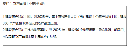 统筹发展农产品初加工、精深加工和综合利用加工,推进农产品多元化开发、多层次利用、多环节增值。拓展农产品初加工。鼓励和支持农民合作社、家庭农场和中小微企业等发展农产品产地初加工,减少产后损失,延长供应时间,提高质量效益。果蔬、奶类、畜禽及水产品等鲜活农产品,重点发展预冷、保鲜、冷冻、清洗、分级、分割、包装等仓储设施和商品化处理,实现减损增效。粮食等耐储农产品,重点发展烘干、储藏、脱壳、去杂、磨制等初加工,实现保值增值。食用类初级农产品,重点发展发酵、压榨、灌制、炸制、干制、腌制、熟制等初加工,满足市场多样化需求。棉麻丝、木竹藤棕草等非食用类农产品,重点发展整理、切割、粉碎、打磨、烘干、拉丝、编织等初加工,开发多种用途。提升农产品精深加工。引导大型农业企业加快生物、工程、环保、信息等技术集成应用,促进 农产品多次加工,实现多次增值。发展精细加工, 推进新型非热加工、新型杀菌、高效分离、清洁生 产、智能控制、形态识别、自动分选等技术升级, 利用专用原料,配套专用设备,研制专用配方,开 发类别多样、营养健康、方便快捷的系列化产品。推进深度开发,创新超临界萃取、超微粉碎、生物 发酵、蛋白质改性等技术,提取营养因子、功能成 分和活性物质,开发系列化的加工制品。推进综合利用加工。鼓励大型农业企业和农产品加工园区推进加工副产物循环利用、全值利用、梯次利用,实现变废为宝、化害为利。采取先进的提取、分离与制备技术,推进稻壳米糠、麦麸、油料饼粕、果蔬皮渣、畜禽皮毛骨血、水产品皮骨内脏等副产物综合利用,开发新能源、新材料等新产品,提升增值空间。