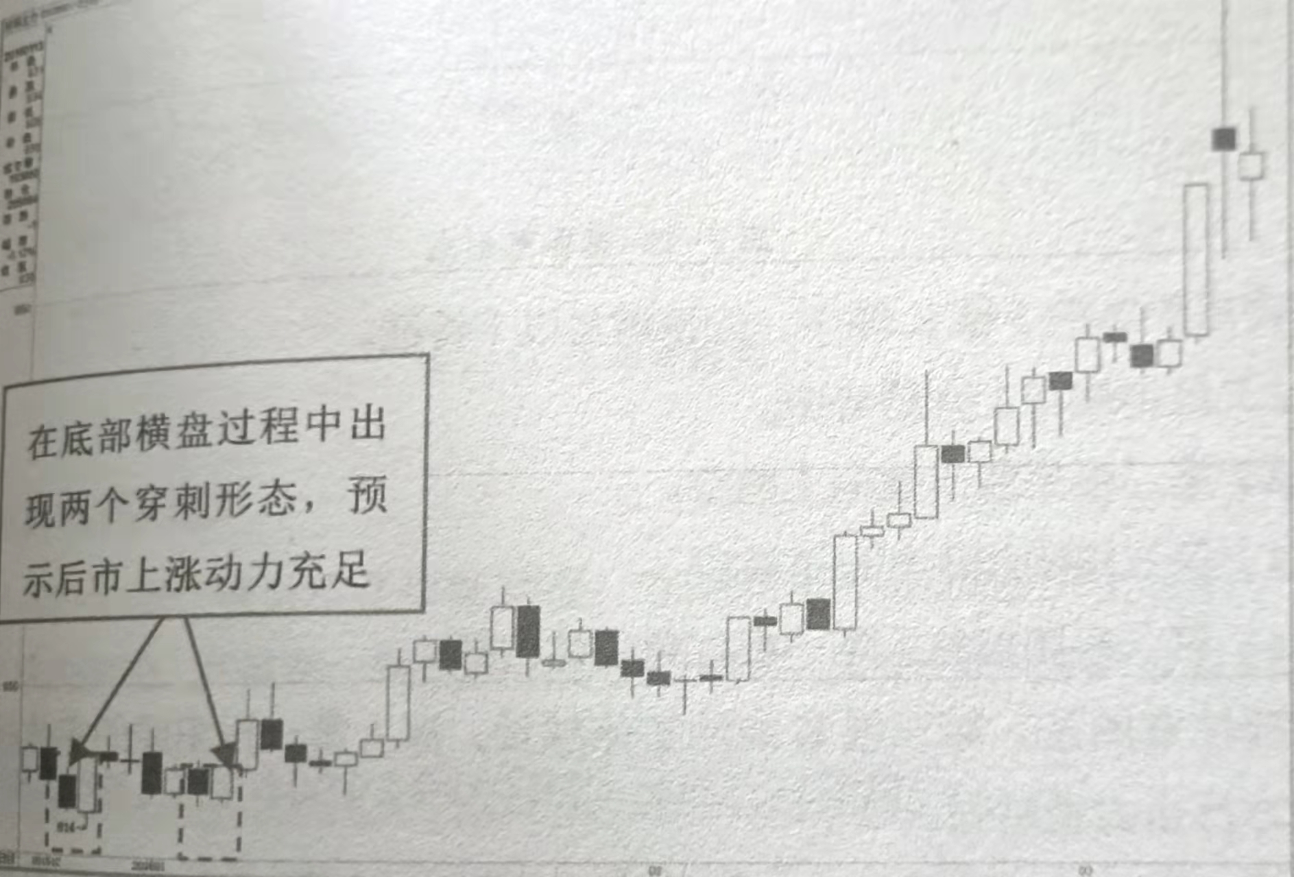 穿刺形态与乌云盖顶形态是相互对立的形态。穿刺形态发生在下跌行情中,是反弹信号。穿刺形态通常由两根K线组成,其中,第一根K线下跌阴线而第二根上涨K线应具有较长的红色实体,其下影线应该在前一天的实体之下。