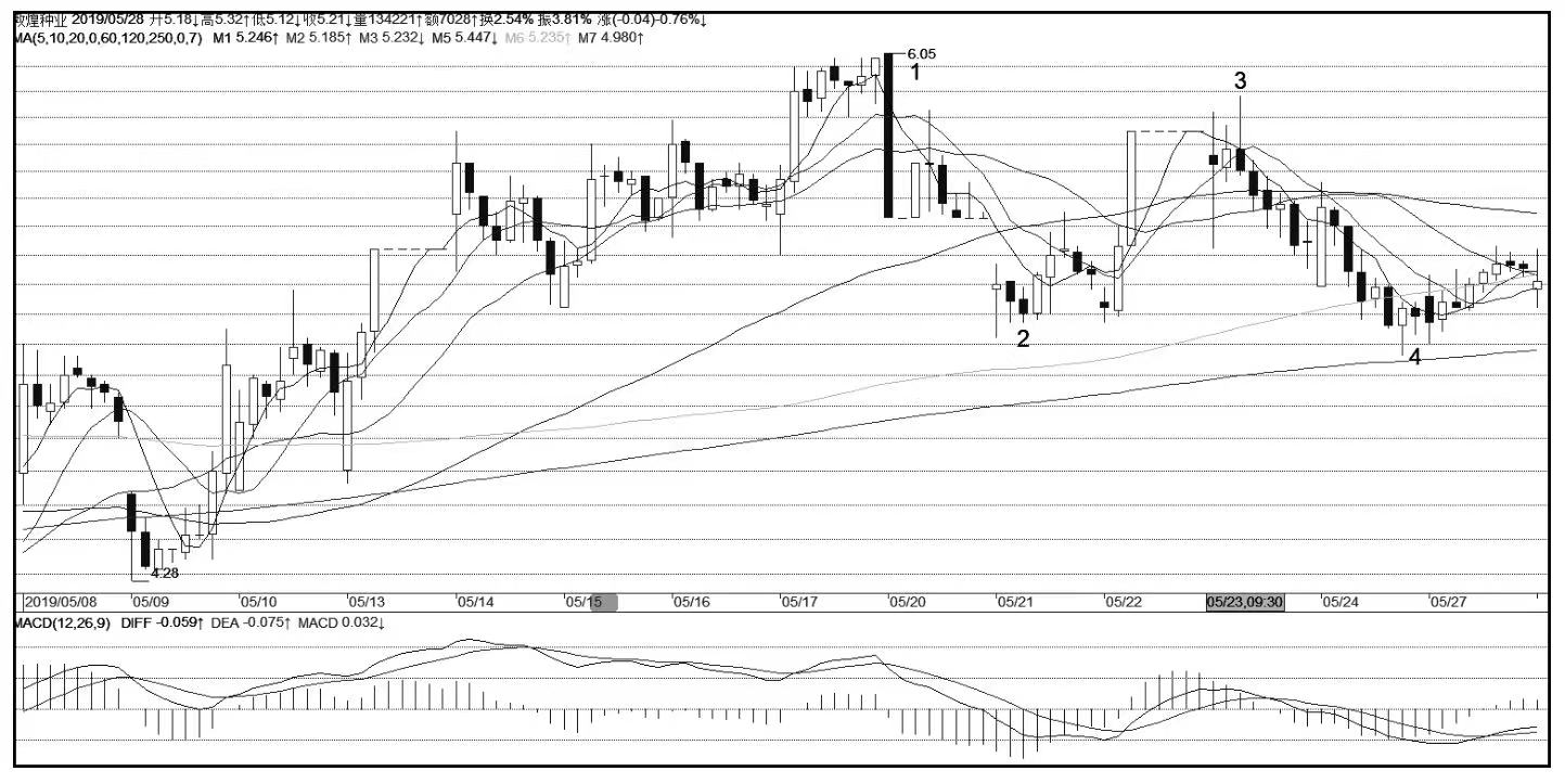 在图1中,1-2、2-3、3-4三段走势构成a+b+c结构,其中3-4是1-2的背驰段。注意MACD的特征,MACD跌破零轴出现绿柱子后,随着2-3段回到零轴上方出现红柱子,然后再随着3-4段下到零轴下方出现第二次绿柱子,第二次提示背驰的发生,从走势上也可以直观看到这个背驰。图1中1和3、2和4两个高点和两个低点的高低差并不大,属于横盘式的,这种形态也叫作双回抽。双回抽的操作是另外一回事,重点是看这种形态出现在高级别图形的哪个阶段,并不是出现这样的图形就可以不问缘由地下单,包括后面要讨论的各种单独的图形,都不可以独立地作为操作的准则,而是要在整个系统里面起作用,这是要强调的地方。