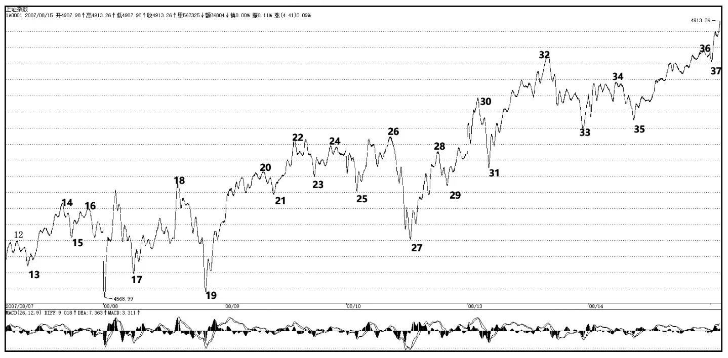 在图1中,观察16-27中枢的第三类买点、28-31中枢的第三类买点是不需要这样详细去分析的,只要能划分出次级别走势段,并且33位置在28-31中枢之上就可以了。如果本来要观察的就是28-31中枢第三类买点,那么必须观察其内部结构。