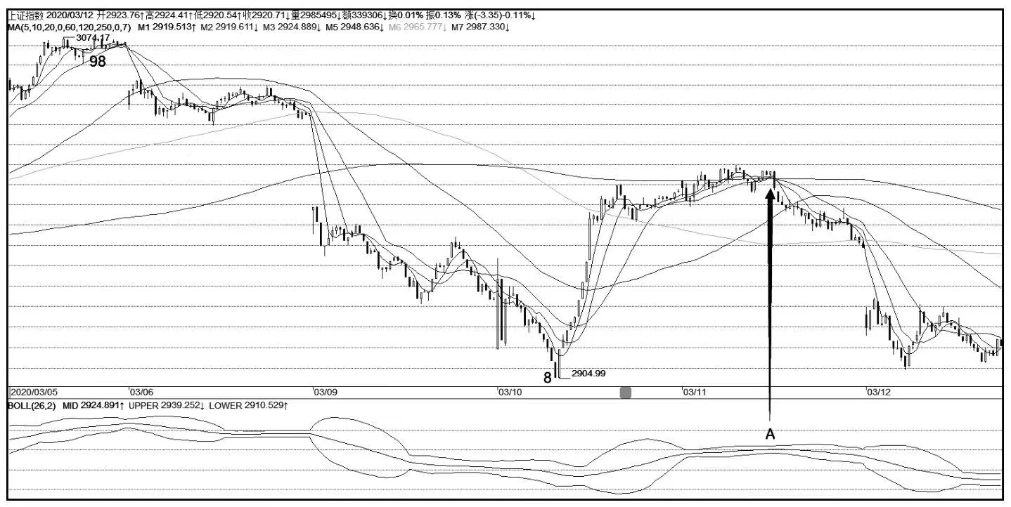 在图1中,98-8是1分钟下跌趋势,随后8-11完成最低线段的次级别走势要求,并从9位置开始中枢震荡到14位置,这11-14的部分就属于中阴阶段。因为理论的最低要求走势都已经走完,但从8位置开始的1分钟级别走势类型明显还不可能确认结束。在14位置,就存在向上突破、向下突破、继续中枢震荡这三种可能。而在更高级别的走势图中,BOLL通道指标的表现,就是通道变窄一段时间后开始收口,见图2中的A位置所对应的走势位置。