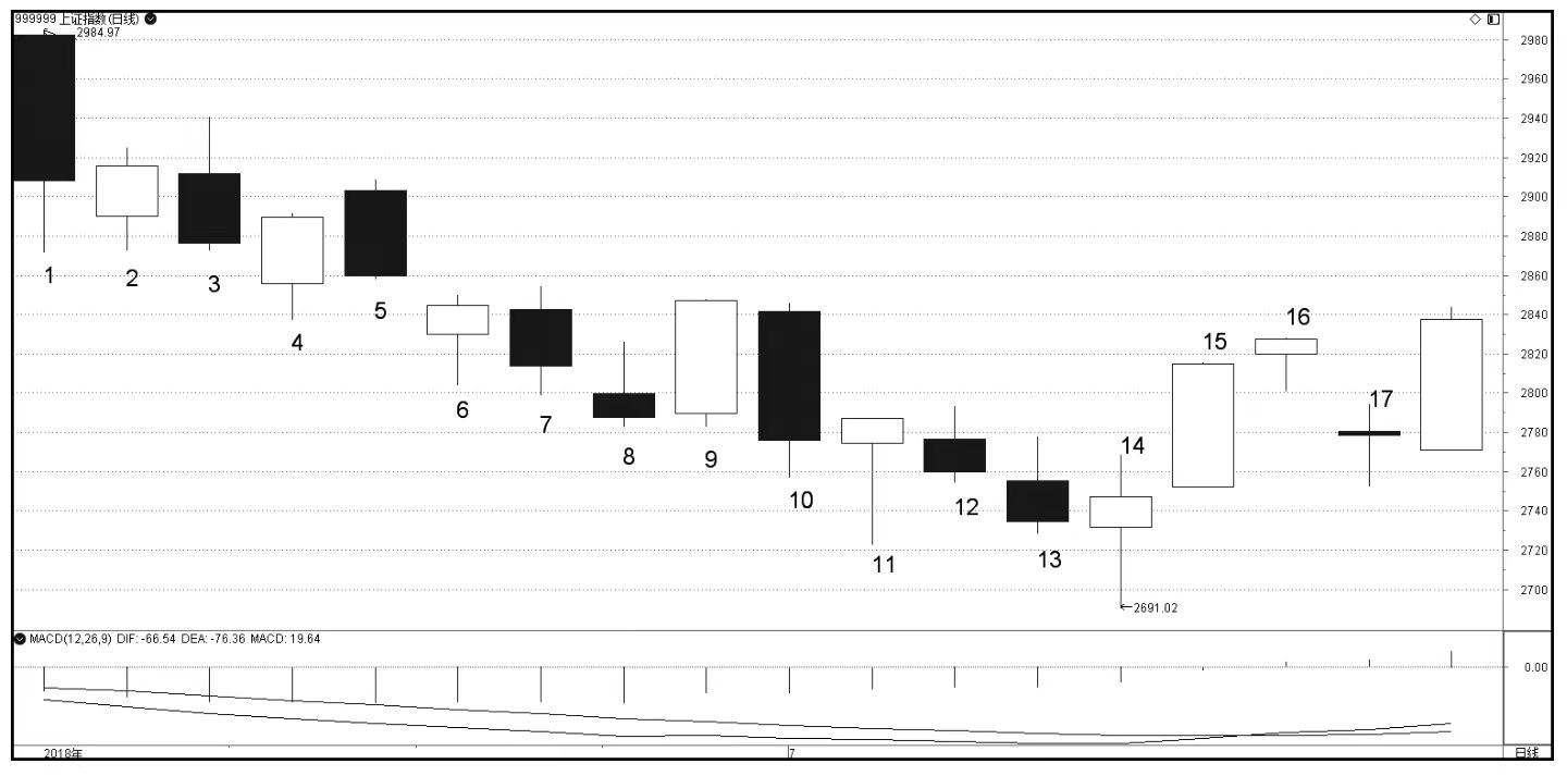 图3中的日线图与图6-2的周线图有着对应关系。K线1至K线28中,1-5是第一个周K线,也就是周底分型的第一元素;6-8是第二元素;9-13是第三元素。
