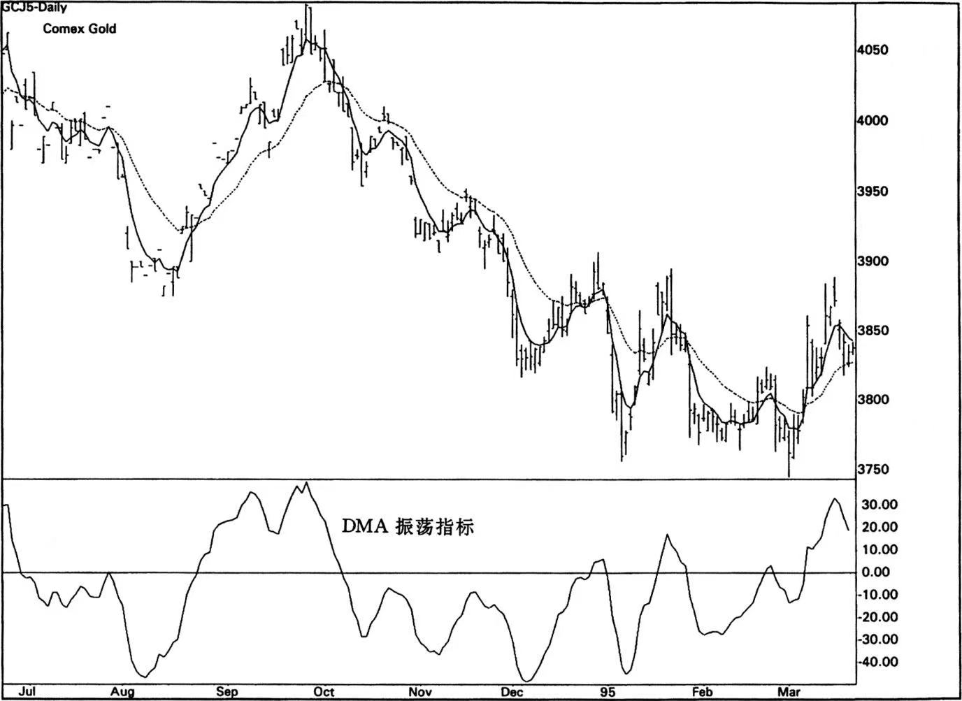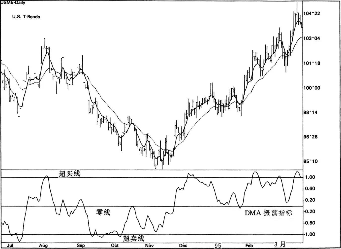 注:DMA的零线与5天EMA和20天EMA的等值点相对应。超买线位于+1.00,超卖线位于-1.00
