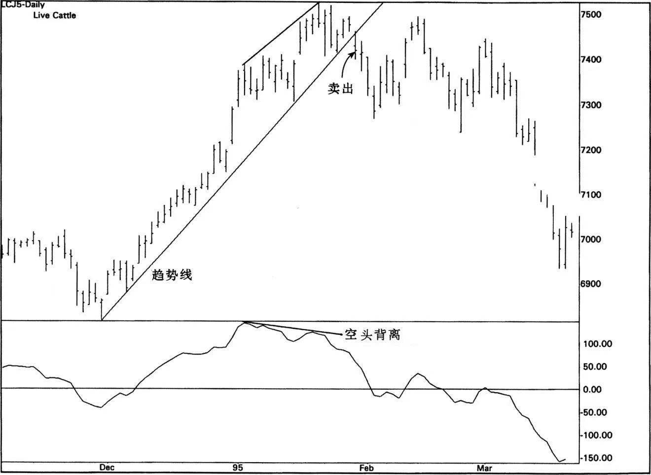 注:在价格和DMA振荡指标之间出现空头背离后,生牛市场突破了看涨趋势线。趋势线的突破确认了振荡指标的信号