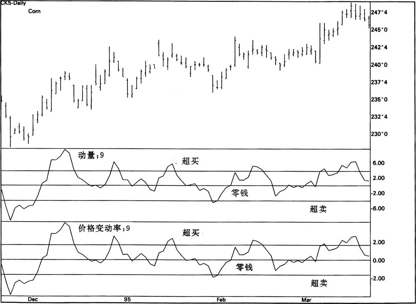 注:动量和价格变动率的计算方法不同,但得出了近似的曲线。两者都是测量价格变化速率的简单的逻辑方法。注意两个指数的竖轴的缩放比例是不同的,但这不影响它们的解释