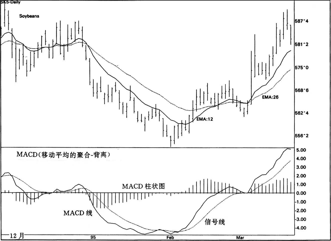 移动平均的聚合—背离(MACD)是由杰拉尔德·阿蒲尔(Gerald Appel)发明的,是最有趣、最可靠的技术指标之一。它综合了振荡指标和趋势跟踪指标的优点。这个指标既可以测量市场的动量,又保持了跟踪趋势的能力。