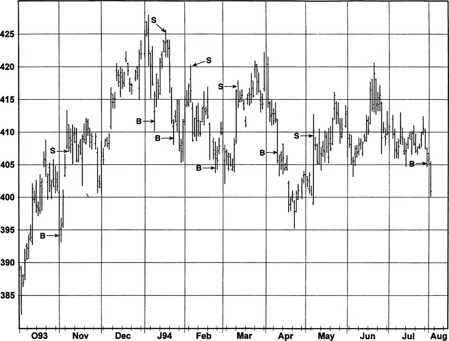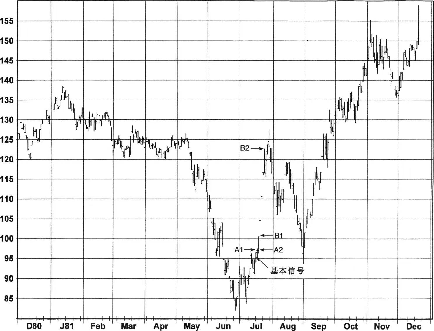 图2以市场比较这两个系统。(尽管可以容易地拿更近期的例子来说明,但这个特别的情况是我所见过、系统绩效对系统数值微小变化的敏感性最显著的例子。)基本系统的买进信号(如在20天的最高价格上方收盘)在7月16日收到。这个买进于7月17日被系统A确认,当时的收盘价比前日的最高价位(A1点)高了9个点。然而,系统B要求的是10个点的突破,所以直到第二天(B1点)才确认了这个信号。