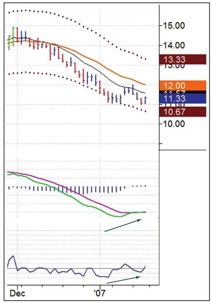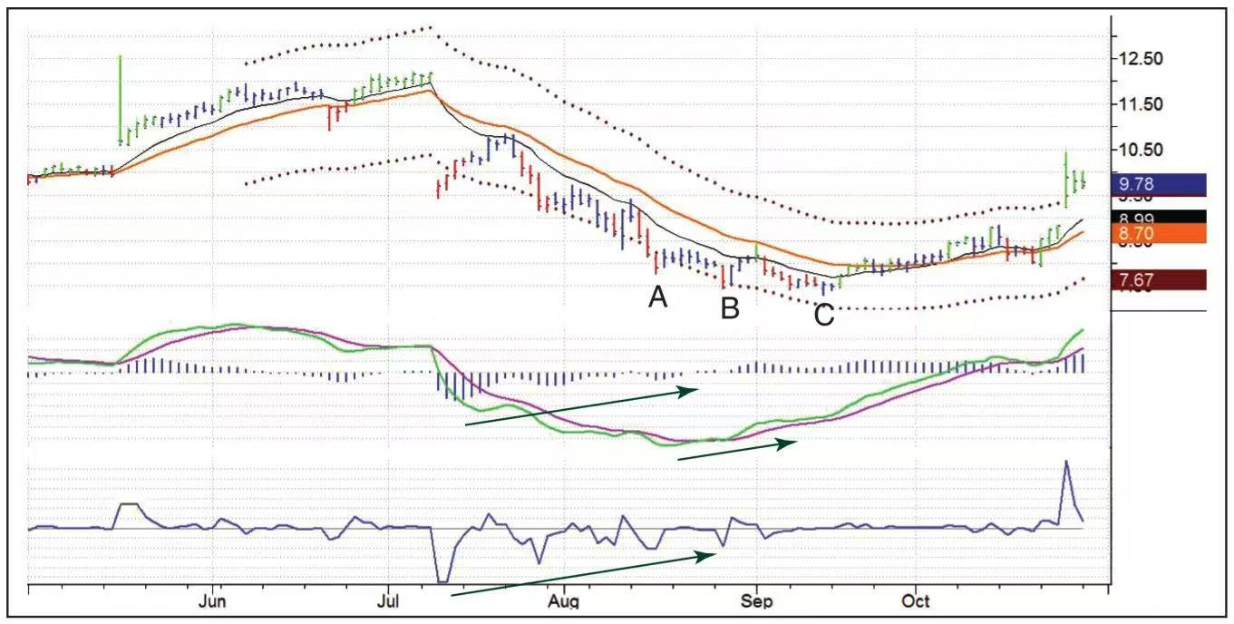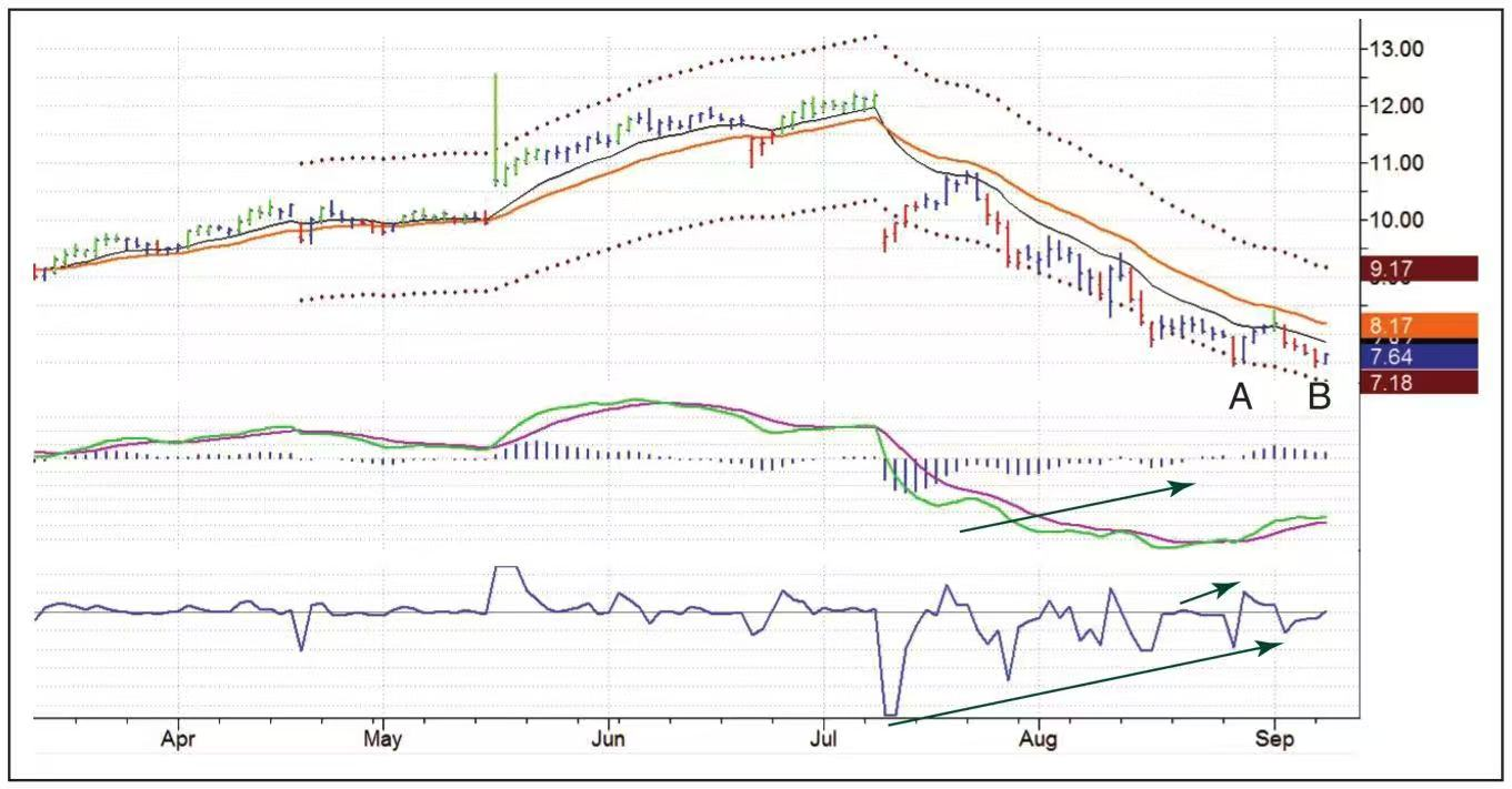 好的交易机会总是姗姗来迟,CPWR的这次交易机会也不例外。该股7月和8月都下跌,MACD线在8月份极度底背离。股价在8月份首先到达低点A也就是7.46美元,只要有人在这个位置买入并把止损设在这个低点上,那必定会在9月份被洗出局,而彼时股价轻微跌破前期低点至7.44美元,也就是图中的B点。接下来的问题就是:如果你在B点买入,你会把止损设在哪里?