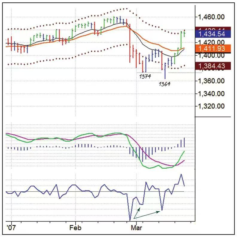 2007年2月标普500指数经历了一波快速小幅下跌,跌破通道后似乎找到了底,因为开始上涨。