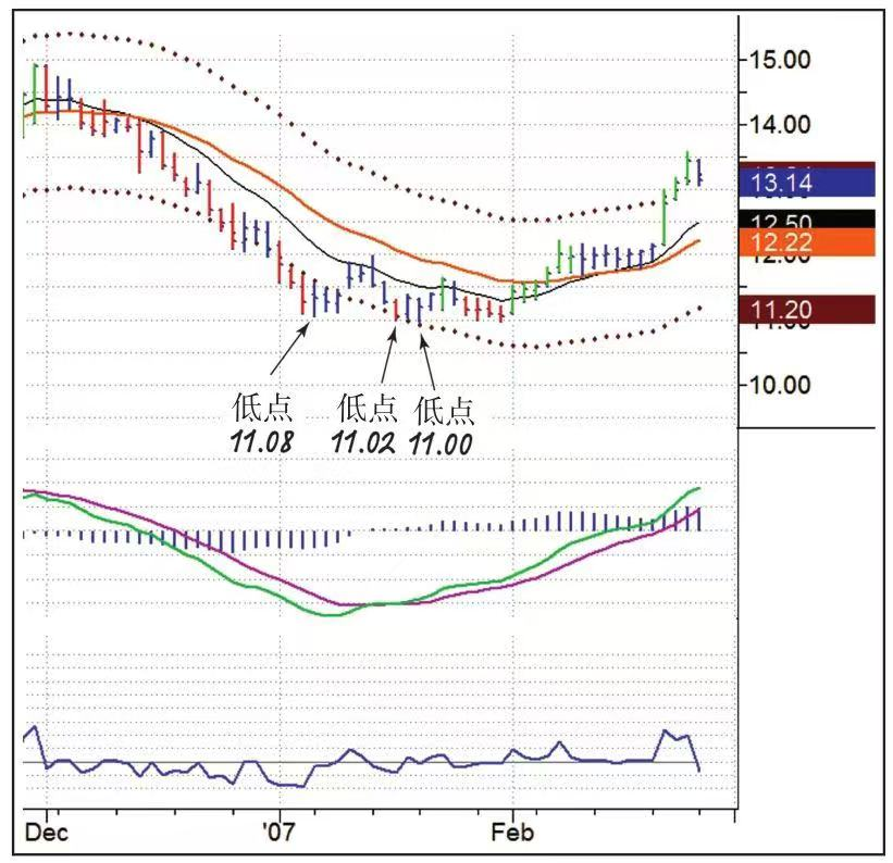 当股票跌向重要低点时成交量开始变小,所有眼睛只盯着股价但没有多少人行动,因为人们都在等着看这个支撑是否有效。买单很少的时候,一个轻微的卖单就能让股票下跌到前期低点,也就是很多严谨的职业交易者喜欢操作的地方。