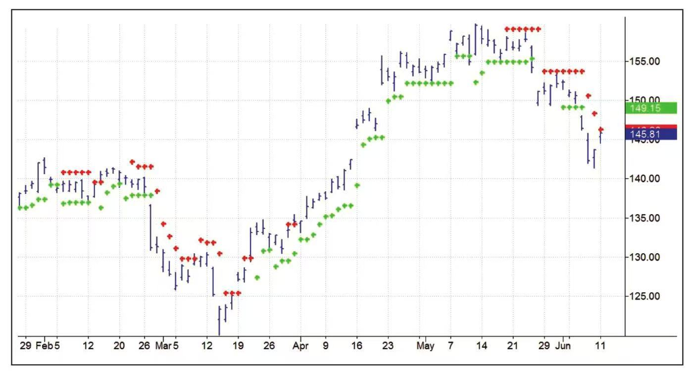 抛物线止损指标(SAR)是由威尔斯·威尔德发明并于1976年首次对外公布,这是人们第一次尝试包含时间概念的止损方法。这套系统可能每天都会移动止损价,不但如此,只要价格向对交易有利的方向移动并创出新高,止损移动速度就呈加速状态。