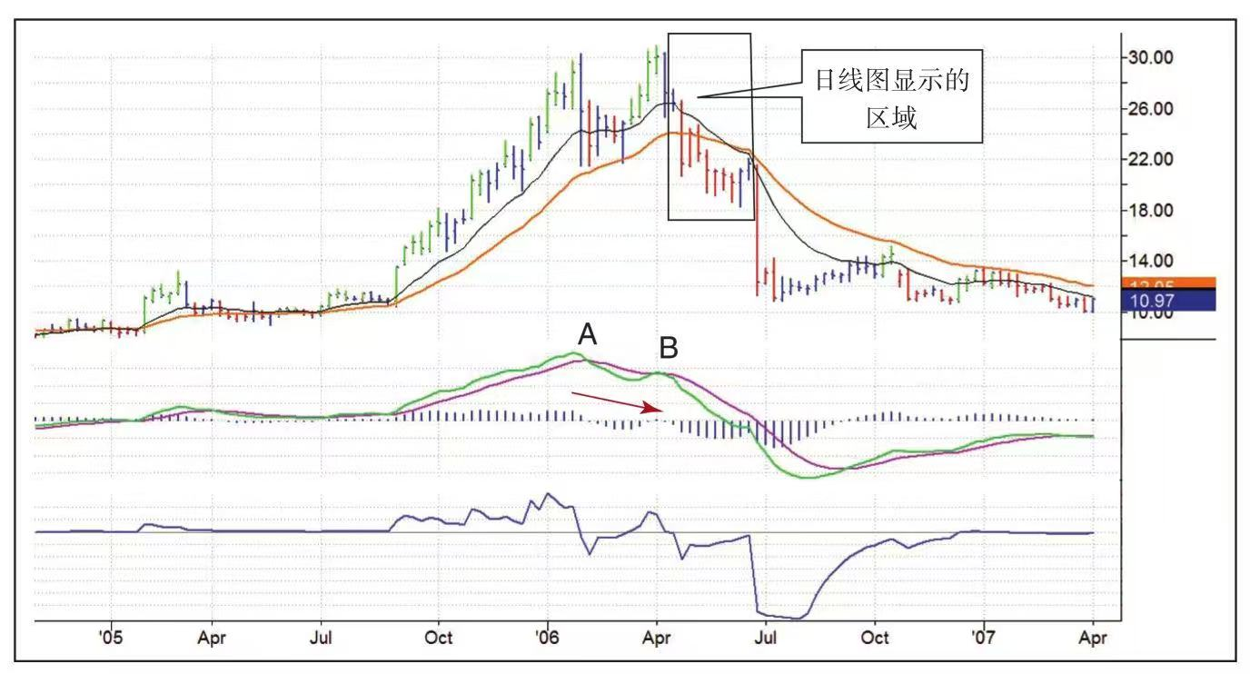 NWRE周线图显示在2006年年初接近顶部时极好的做空机会,向上假突破,图中A点到B点的顶背离,提醒着做空者放空。我们从图的中间部分可以看到交易信号非常清晰,但越接近图的右侧,市场变得越模糊。尽管图的中间部分很美,但当时我也没有找到做空的经纪人,他们都希望我当时就交易。
