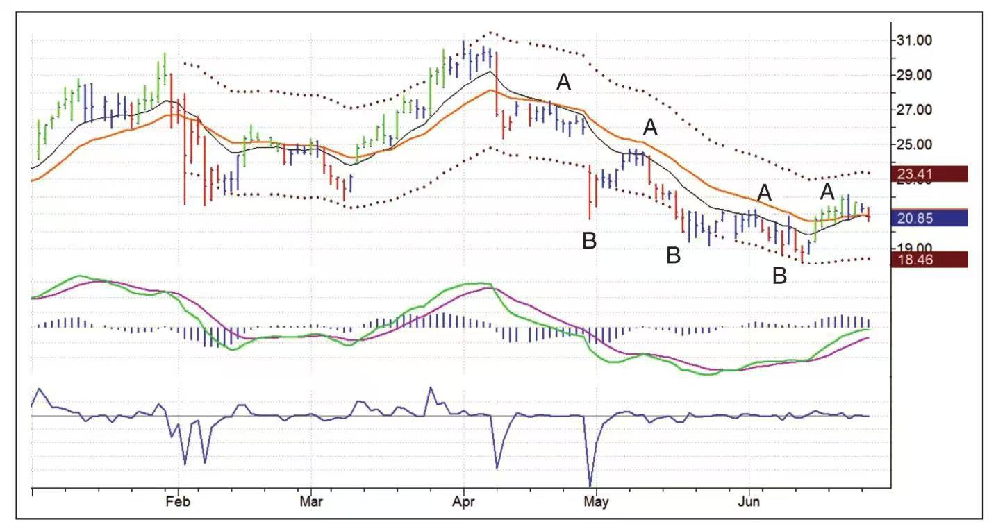 4月份早期,NWRE暴跌后,价格回拉到价值区,也就是两条移动平均线中间的区域。这次回拉给交易者做空的机会,之后价格再度下跌,并跌破通道下轨。5月份,价格又回到价值区,又给出了做空的机会;5月中旬,价格跌破通道下轨进入超卖区,预示着该平仓了。这种钟摆式的运动一直持续到图的右侧,之后又持续了一段时间。