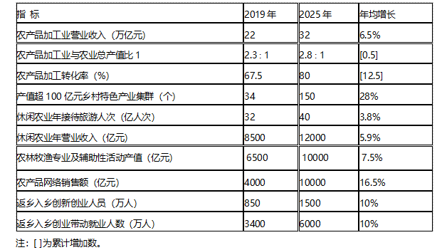 到2025年,乡村产业体系健全完备,乡村产业质量效益明显提升,乡村就业结构更加优化,产业融合发展水平显著提高,农民增收渠道持续拓宽,乡村产业发展内生动力持续增强。农产品加工业持续壮大。农产品加工业营业收入达到32万亿元,农产品加工业与农业总产值比达到2.8︰1,主要农产品加工转化率达到 80%。乡村特色产业深度拓展。培育一批产值超百亿元、千亿元优势特色产业集群,建设一批产值超十亿元农业产业镇(乡),创响一批“乡字号”“土字号”乡土品牌。乡村休闲旅游业优化升级。农业多种功能和乡村多重价值深度发掘,业态类型不断丰富,服务水平不断提升,年接待游客人数超过40亿人次,经营收入超过1.2万亿元。乡村新型服务业类型丰富。农林牧渔专业及辅助性活动产值达到1万亿元,农产品网络销售额达到1万亿元。农村创新创业更加活跃。返乡入乡创新创业人员超过1500万人。