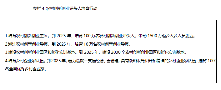 深入实施农村创新创业带头人培育行动,加大扶持,培育一批扎根乡村、服务农业、带动农民的创新创业群体。培育返乡创业主体。以乡情感召、政策吸引、事业凝聚,引导有资金积累、技术专长和市场信息的返乡农民工在农村创新创业,培育一批充满激情的农村创新创业优秀带头人,引领乡村新兴产业发展。培育入乡创业主体。优化乡村营商环境,强化政策扶持,构建农业全产业链,引导大中专毕业生、退役军人、科技人员和工商业主等入乡创业, 应用新技术、开发新产品、开拓新市场,引入现代管理、经营理念和业态模式,丰富乡村产业发展类型。培育在乡创业主体。加大乡村能人培训力度,提高发现机会、识别市场、整合资源、创造价值的能力。培育一批“田秀才”“土专家”“乡创客”等乡土人才,以及乡村工匠、文化能人、手工艺人等能工巧匠,领办家庭农场、农民合作社等,创办家庭工场、手工作坊、乡村车间等。
