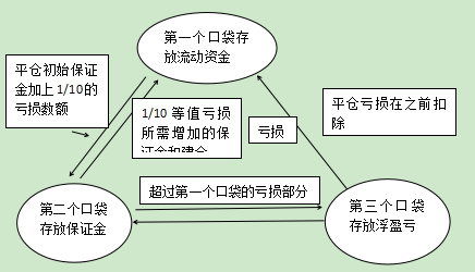 由于价格下跌,投资者持仓所需的保证金相对应减少,则第三个口袋中的盈利可以用来加仓,第二个口袋中多出来的保证金或流入第一个口袋,如图所示;