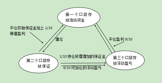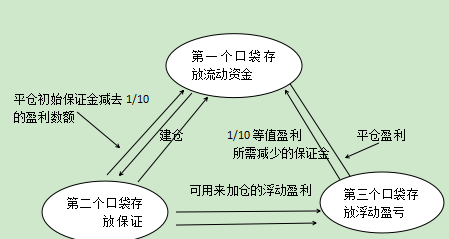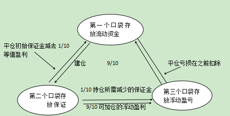由于价格上涨,投资者持仓所需的保证金也对应增加,所以第三个口袋的浮动亏损的1/10会被冻结在第二个口袋中,作为其持仓价值所增加的保证金,另外的9/10会被冻结在第二个口袋中,作为其持仓价值所增加的保证金,另外的9/10则可以用来加仓,或者转移到第一个口袋中,如图所示;