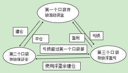 在日内农产品现货交易过程中,资金管理策略的重要性是不言而喻的。口袋理论就是一种有效的资金管理策略,同时也揭示了农产品现货中资金的流向,如图所示;