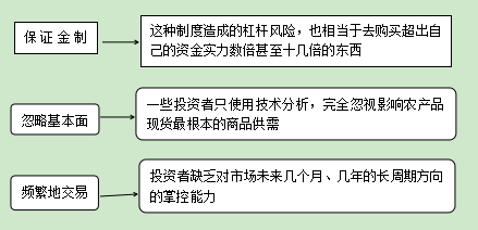 如果说在股票中,是20%的人赚钱、60%的人亏钱、20%的人不赚不亏,那么,在农产品现货投资中的情况绝对是更加残酷的;可能只有只有5%的人赚钱,而95%的人亏损。农产品现货投资的风险要远远高于股票投资的风险的原因包括3个方面,如下所示;