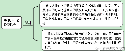 与多数农产品现货投资者的短线投资者理念完全不同的是,力量投资理论通过中长期的时间跨度,而且是多周期、多力量的综合研究来分析市场。当投资者研究一个农产品现货的虚拟是时,所看到的是几周、十几周、几个月、十几个月、几年的市场运行状况,也就是投资者使用力量投资理论,对农产品现货做专业中线投资时的“大方向”。寻找中线投资机会的方法可以分为两部分,如图所示;