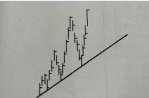 在线图上作趋势线时,应当把它描画在全部价格范围之下或之上。有些图表分析师更喜欢通过收市价格来作趋势线,这种做法并不标准。虽然收市价格在全天的所有价格中确实可能是最重要的,但它依然只能代表全日价格活动的一个片段。而当日全部价格范围包含了当日的所有价格变化,理应更有意义,如图所示。