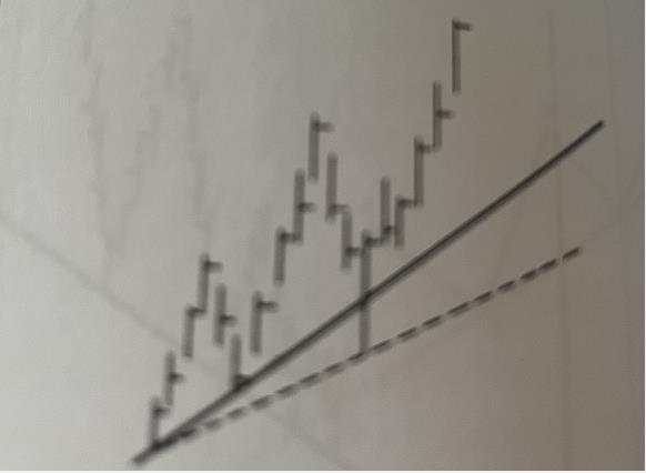 棘手的是在这种情况下没有一成不变的规则可循。有时候,尤其是在随后的市场行为证明原趋势线依然有效的情况下,我们最好忽略这种“毛刺”。有些时候则必须折衷一下如图中虚线所示,补充一条新的实验性的趋势线。那么图表分析在考察未来价格时,就既有原趋势线(实线)、又有新趋势线(虚线)以资参照了。这里有条普遍经验;如果突破原始趋势线的动作的规模相对较小,只是当天内的一时之举,并且收市价又回到原趋势线之上,那么上策可能是忽略这个“毛刺”,仍旧使用原趋势线。正如其他许多市场分析领域一样,碰上这种模棱两可的情况时,分析者只有靠自己的经验和主观判断来定夺。