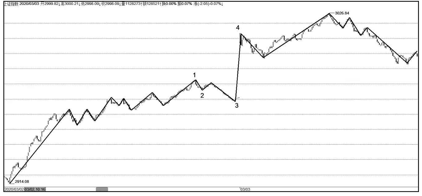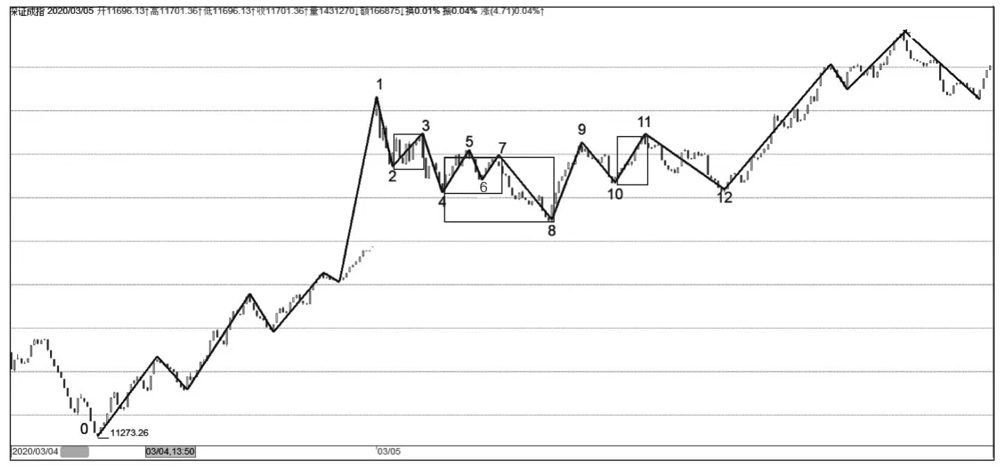 在图1-7中,2的位置高于前面的特征序列高点,所以1-3属于第二类破坏。线段的第二类破坏本来就意味着对原线段的破坏力度不够,而从3开始一个跳空又创新高,这时的3-4仍然属于原上升线段的一部分。但如果1-2笔属于特征序列的第一类破坏,而4后面又向下延伸出标准线段,那么1-3和3-4就都是独立的线段。