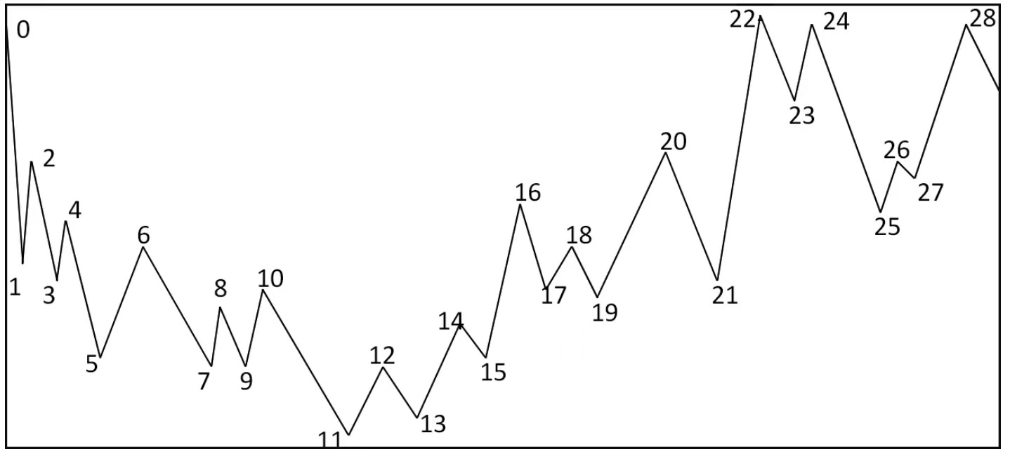 在图1-1中,从2-3开始观察特征序列,到12-13、14-15、16-17三个特征序列出现底分型,则从1开始的线段到该底分型的最低点结束,即1-14。在这个例子中,特征序列的底分型出现之前,都是按向下线段来取特征序列,并且不能确认原线段结束。所以,虽然14-17是一个破坏了1-14的线段,但是在特征序列的视角中,底分型出现之前,14-17仍然被看作从1开始的向下线段的一部分,直至特征序列的分型出现后再进行划分,而不是从14开始按向上线段取特征序列,这是要注意的地方。14位置的特征序列底分型出现之后,由于该底分型确认了1-14线段的完成,因此14-17线段才开始被看作向上线段,特征序列的取值也按向上线段的方式来取,这时的特征序列就和1-14没什么关系了。