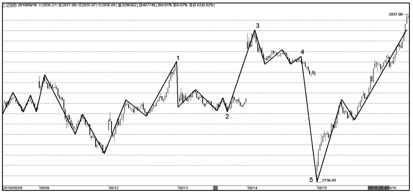 在图1-6中,1-2中的三个低点一个比一个低,是一个独立的线段。从2位置开始到当日收盘时并没有出现新的向上线段,但第二天开盘有大幅的跳空高开出现缺口。这时1-2是独立的下降线段,而2-3的跳空破坏了1-2的线段,这种逆着原线段方向的跳空就可以被当作一个线段来处理,图中1-2、2-3是两个独立的线段。同样的跳空出现在4-5,由于这一个跳空是顺着3开始的下降线段方向,跳空出现在该线段的方向中,所以这个跳空就被当作3-5线段中的一部分。