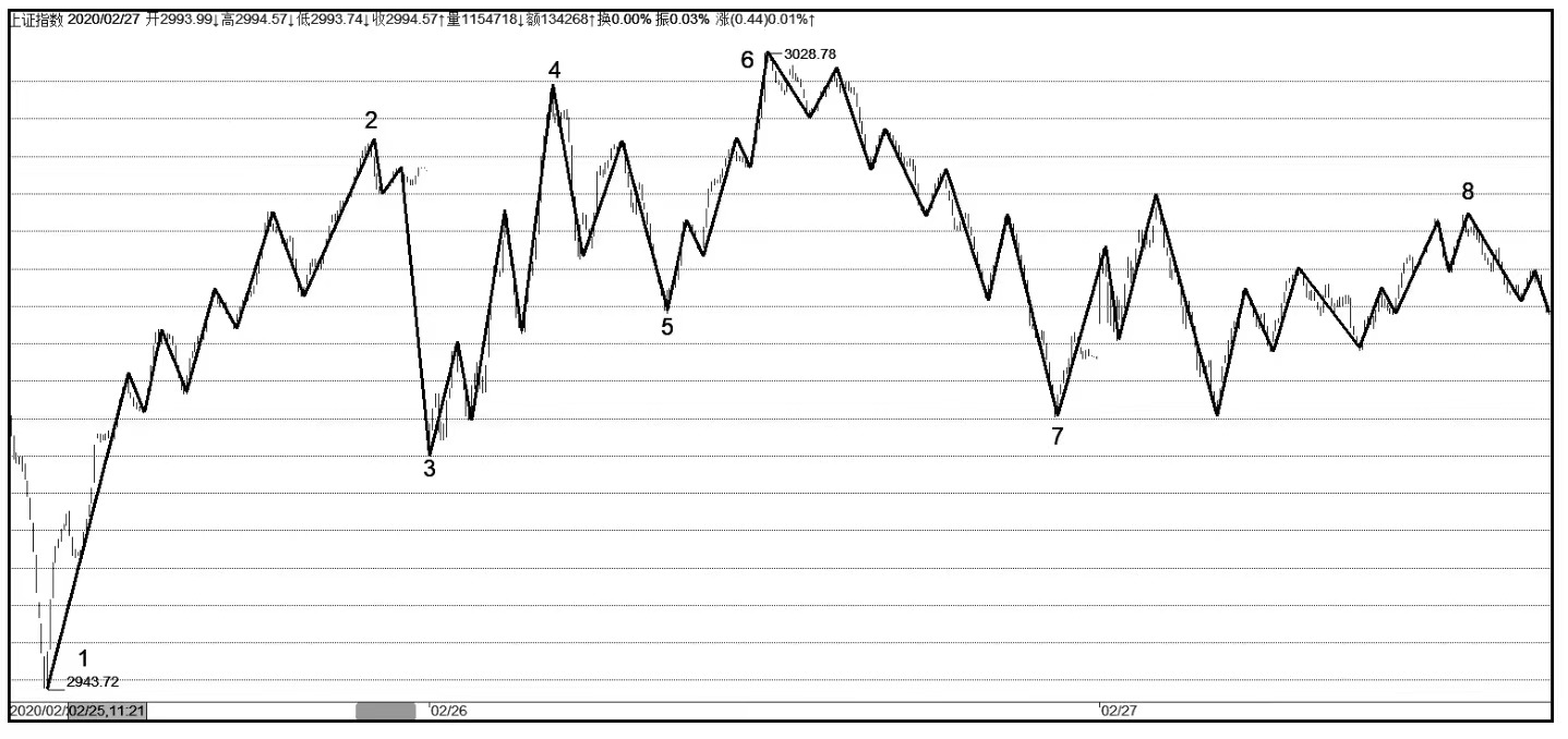 在图1-1中,共有七个1分钟线段,假设线段1-2之前的线段和线段7-8都是已经被确认完成的,那么线段1-2、2-3、3-4其中的重叠区间就是1分钟级别中枢,该中枢区间的高点是2,低点是3,而线段4-5、5-6、6-7、7-8由于都有一部分在该中枢区间范围内,所以就意味着该中枢在延续。