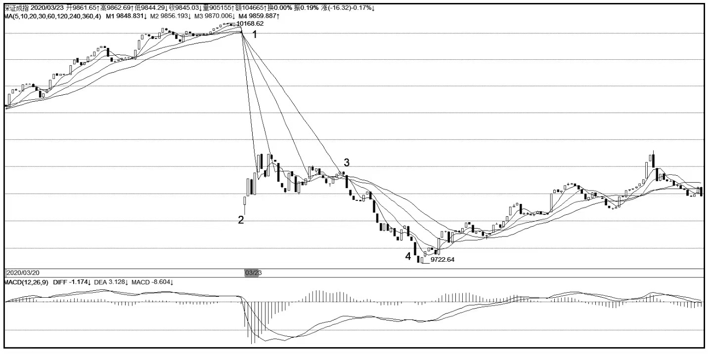 在图1中,1-2、2-3、3-4三段走势构成a+b+c结构,其中3-4是1-2的背驰段。注意MACD的特征,MACD跌破零轴出现绿柱子后,随着2-3段回到零轴上方出现红柱子,然后再随着3-4段下到零轴下方出现第二次绿柱子,第二次提示背驰的发生,从走势上也可以直观看到这个背驰。图1中1和3、2和4两个高点和两个低点的高低差并不大,属于横盘式的,这种形态也叫作双回抽。双回抽的操作是另外一回事,重点是看这种形态出现在高级别图形的哪个阶段,并不是出现这样的图形就可以不问缘由地下单,包括后面要讨论的各种单独的图形,都不可以独立地作为操作的准则,而是要在整个系统里面起作用,这是要强调的地方。