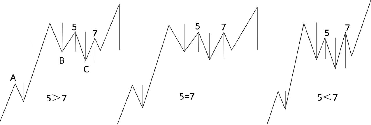 对于线段来说,破坏有两种形式。第一种,笔破坏后延伸出标准线段的情况意味着明确的反向能量释放,该反向能量释放打断了原线段的能量释放过程。第二种,例如,图1中的左一就属于在C位置经过底部的酝酿之后再次确认向上,有两次确认的过程。而图1中的右一,相当于反向线段的第一笔破坏连前面线段最后一个特征序列都没碰到,说明反向能量释放的力度很弱,后面的7位置又再次升破5位置,说明原线段的上涨动能并没有消失。
