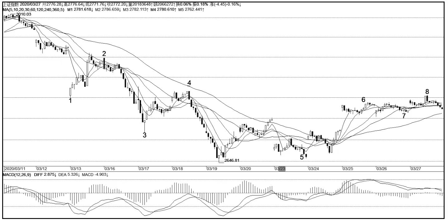 在图1中,1-2、2-3、3-4构成一个5分钟级别中枢,递归的过程在前文中有详细分析。5-6、6-7、7-8三段重叠出来的中枢级别也是5分钟级别。在图形上,前者就属于向下奔走型的中枢,而后者是一个窄幅的横盘(5-6段趋势的第二个中枢与6-7、7-8)。对应的MACD,前者是对零轴的两次回抽并且振幅很大,后者就是平缓地向零轴回抽的过程。