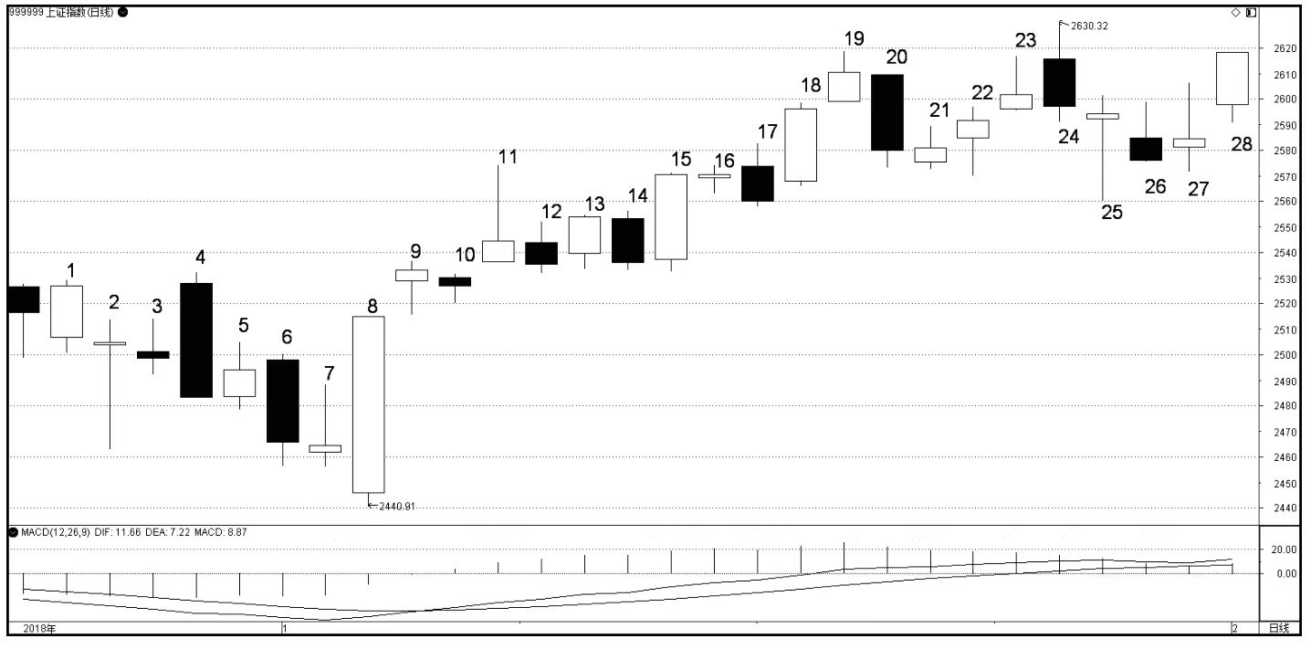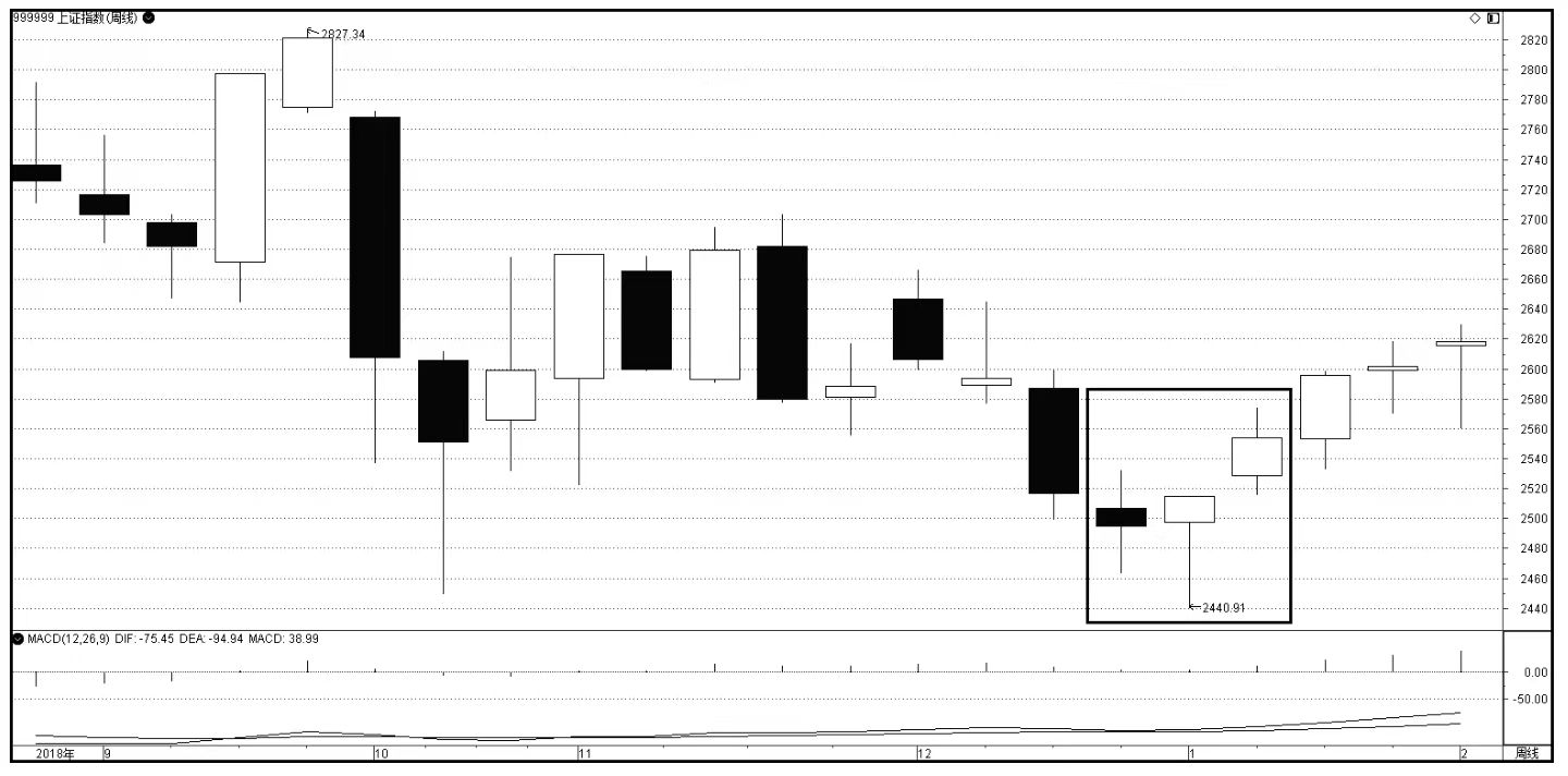 在上证指数2019年1月4日的周线图上,一个周线的底分型出现,最低点是2440.91,分型的上沿是2574.41,如图2所示。对应的日线级别走势是向上一笔的延伸,如图6-3所示。