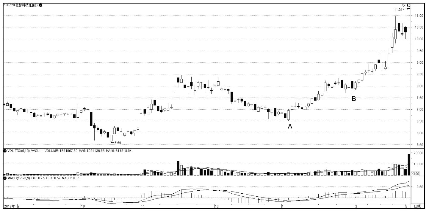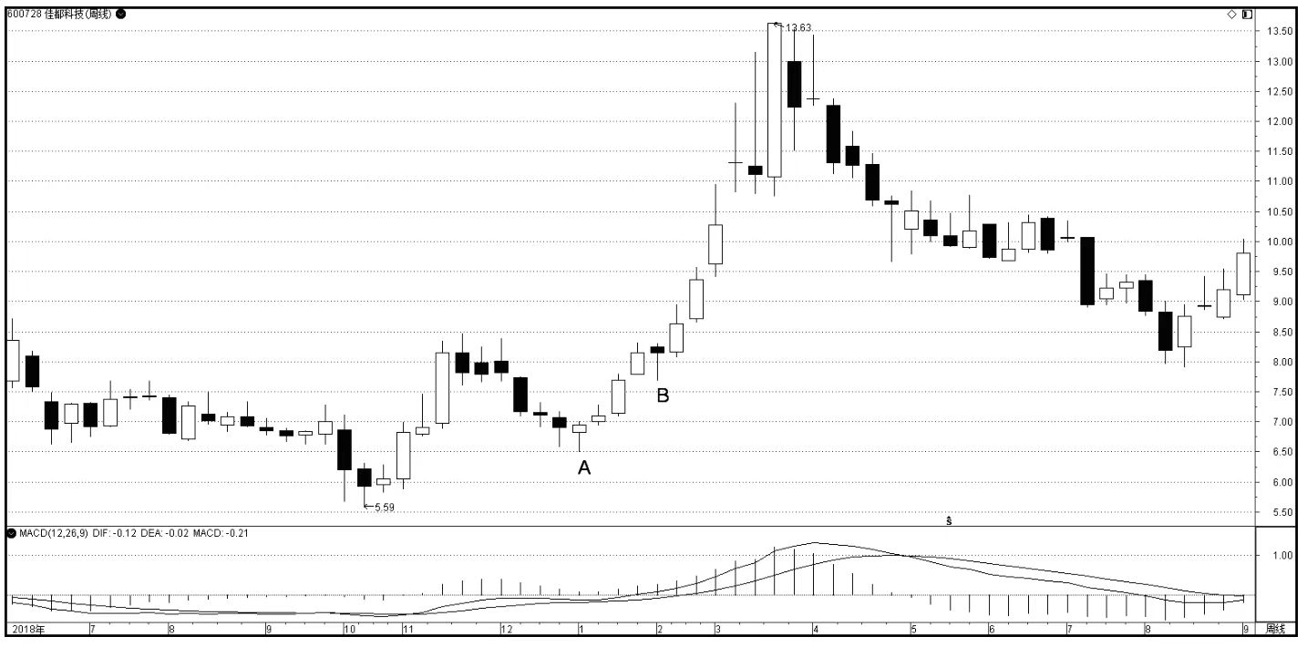 第二类买点的特征,在形态上就是回升后的横盘或者回抽过程,回抽的力度当然越小越好,第二类买点的形成如果是在下跌过程中,后面要突破第一段的高点就需要更大的能量来支撑才行。这种横盘与小力度的回抽,其实就是分型后的那几根K线。在小级别走势类型中,该段走势一般对应MACD向零轴的回抽、短期均线与长期均线的黏合等特征。