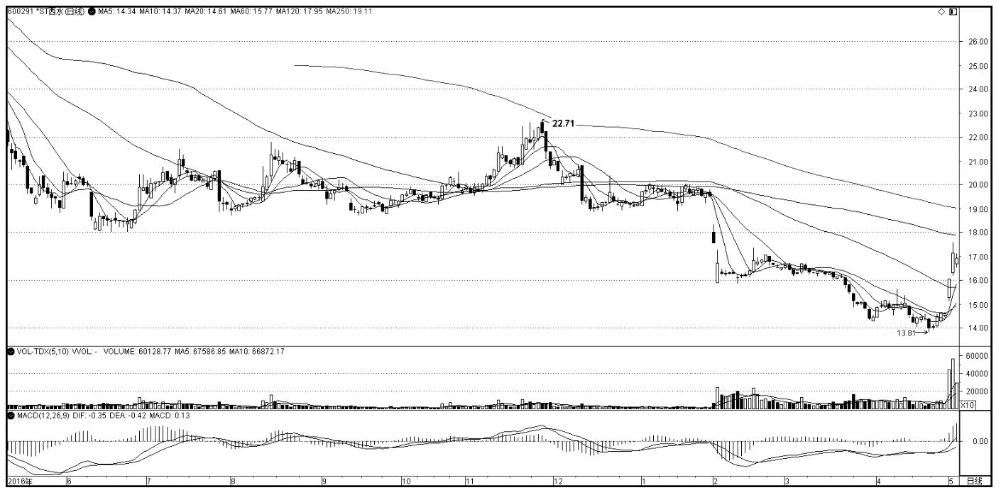 在图1中,从2016年11月28日的22.71位置到2017年4月25日的13.81位置,是标准的下跌趋势,并且第二个中枢后还完整地出现一个第三类卖点,同时构成该日线级别第三类卖点的次级别走势中枢后面又出现一个标准的第三类卖点,这种极其标准的第一类买点,如果碰到是绝对不允许错过的。