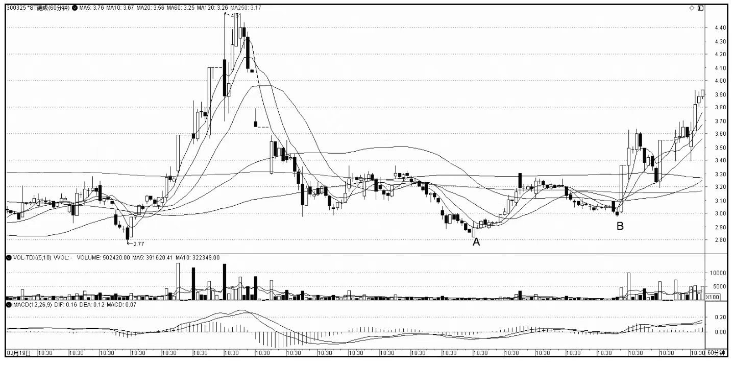 对于操作而言,形成第二类买点的走势结构可能是横盘,也可能是下跌。在图2中A位置回升上来,再回抽到B位置的第二类买点就是下跌的结束点,这和走势类型没有关系,只与走势形态相关。相对而言,下跌的情况可以去次级别寻找背驰点来把握较精确的买点,而横盘的情况很多时候并不能找到次级别的结束点,这时就要靠放量来把握。