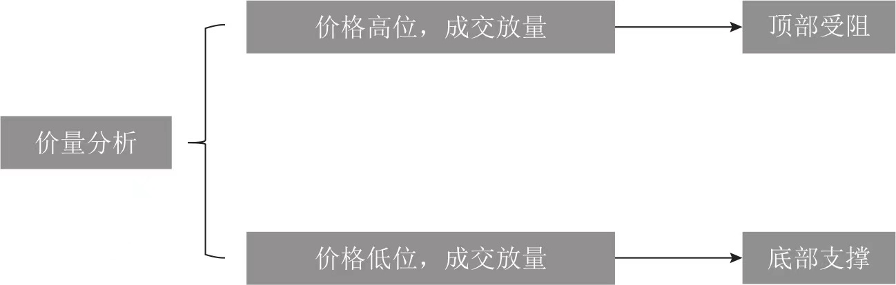 相反,当盘面供应大于需求时,价格往往会一路下跌,当价格跌到某个区间时,成交量开始放大,说明在低价位的情况下,需求被刺激起来了,多开和空平增加,所以随着供应的增加,下面接货的买方越来越多,从而导致价格低位出现较大的成交量,在这种情况下,往往价格处于低位,即将面临反转。价量关系如图2所示。