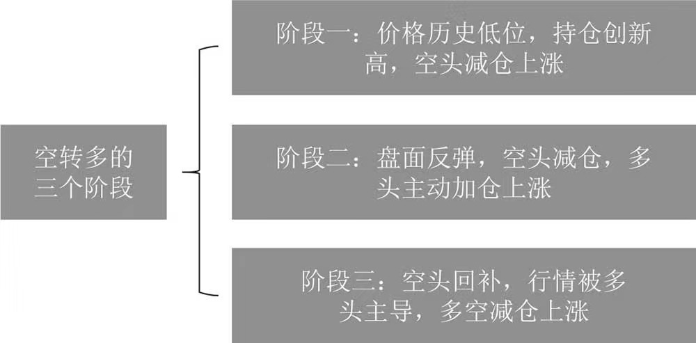 空头行情反转为多头行情一般分为三个阶段(见图3):第一阶段,由于盘面持仓量巨大,超过现货市场库存所有量,空头选择主动减仓,盘面反弹上涨,空头减仓越多,盘面反弹力度越大;第二阶段,盘面的上涨吸引了更多的多头,多头买入热情高涨,推动价格进一步上涨;第三阶段,价格反弹到高位时,空头开始回补,多空双方展开最终较量,一旦多头获胜,将转入长期上涨行情,多空持仓都会减少,持仓量开始下降,价格稳步上涨,多头主导行情。