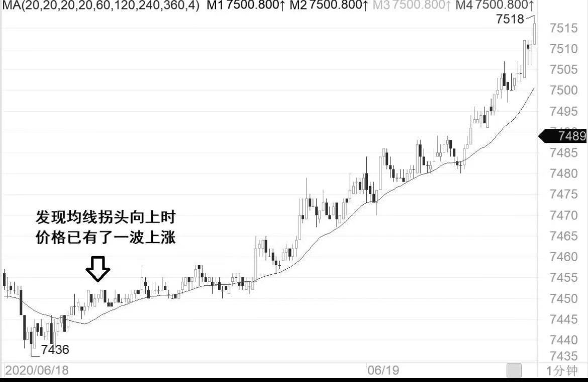 在菜油2009合约2020年6月18日1分钟K线走势图中,价格出现了一波连续上涨的行情,在20周期移动平均线一直保持多头趋势的时候,可调整趋势的走势多次出现,留给了投资者足够多的中途进入的机会,由此可见,只要移动平均线的上升趋势不变,必定会留下许多买点,根本不用担心会错过介入的机会。