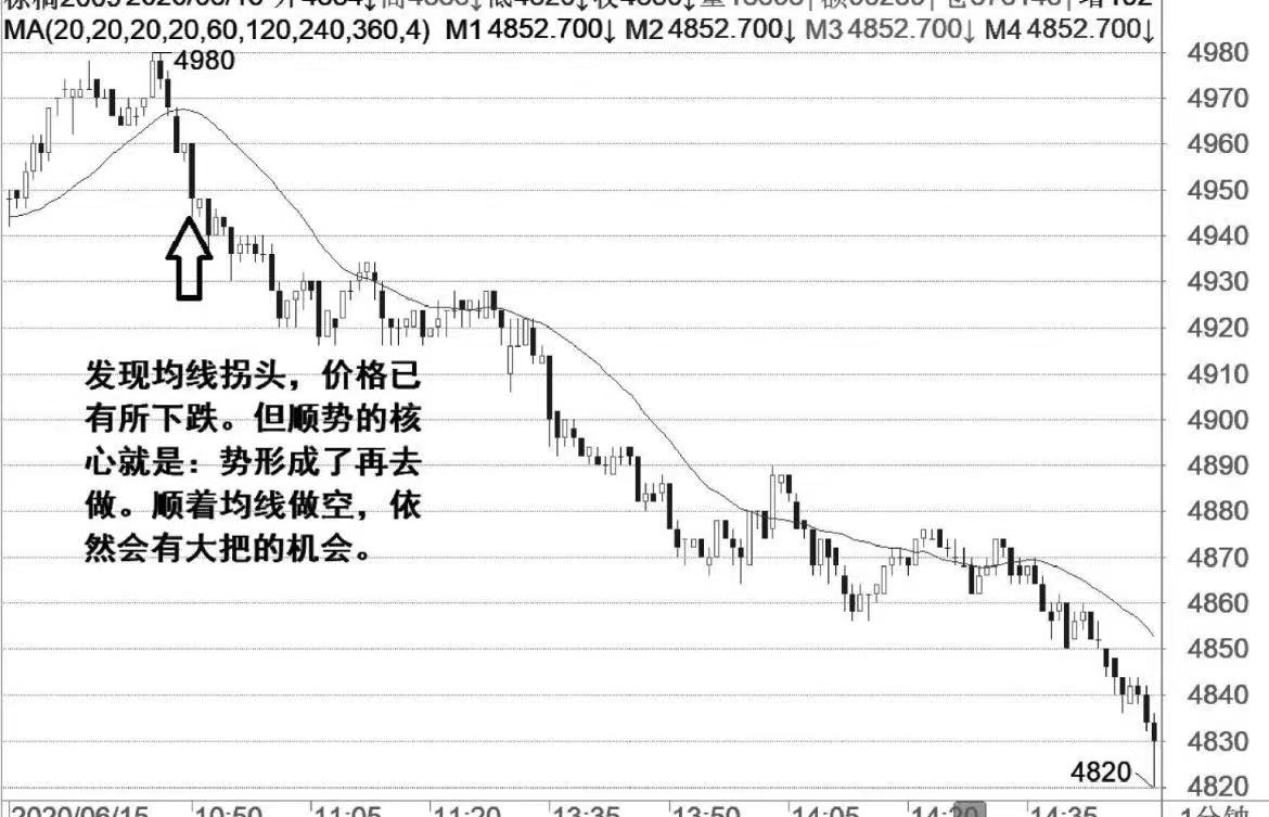 从20周期移动平均线拐头向下之后,趋势便一直保持着下行的状态,此时的“顺势”就是始终保持坚定的做空思路。