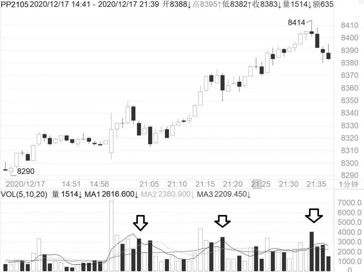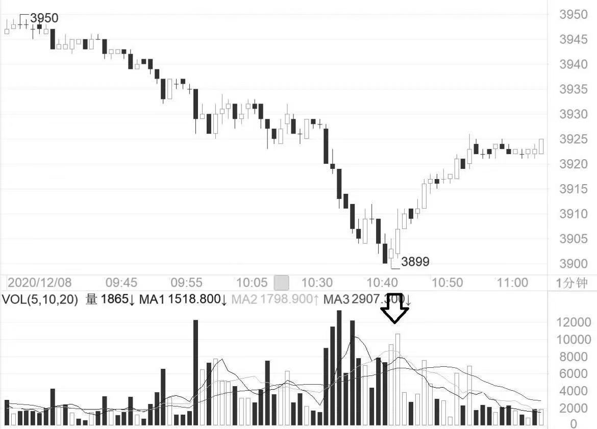 在1分钟K线走势图中,价格下跌的中途形成了反弹的走势,中途的反弹上涨幅度很小,这说明多头力量很虚弱。价格的上涨幅度小,这是极好的事情,但是,在反弹的时候,成交量并没有明显萎缩,面对这种走势该如何分析呢?