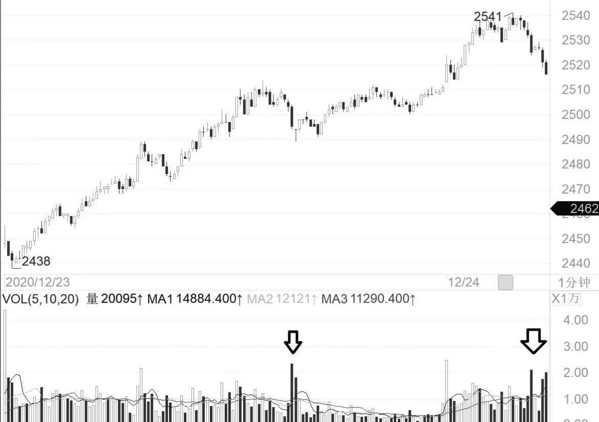 在1分钟K线走势图中,价格在初期上涨过程中调整的回落幅度很小,并且调整时的成交量也没有放大,因此可以判断价格将持续地上涨。在价格运行到中途的时候,出现了一次规模较大的调整,那么在这两次调整的区间可以进行操作吗?