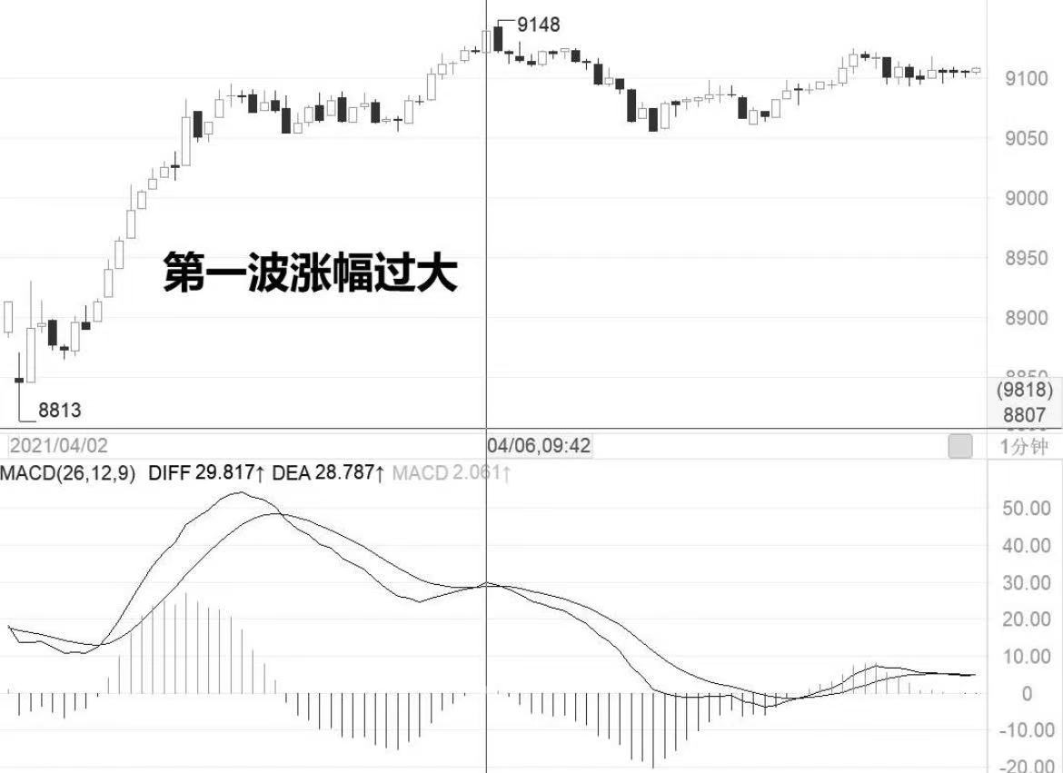 图1中苯乙烯的顶背离是由两波上涨构成的,且第一波上涨幅度较大。如果第一波上涨幅度较小,则很难形成顶背离现象。只有第一波上涨幅度较大,才会带动MACD指标达到一个较高的峰值,而后无论价格如何波动,MACD指标都只有向下修正的空间而没有继续上涨的空间,从而在价格创出新高时,指标只能不断下行形成背离走势。