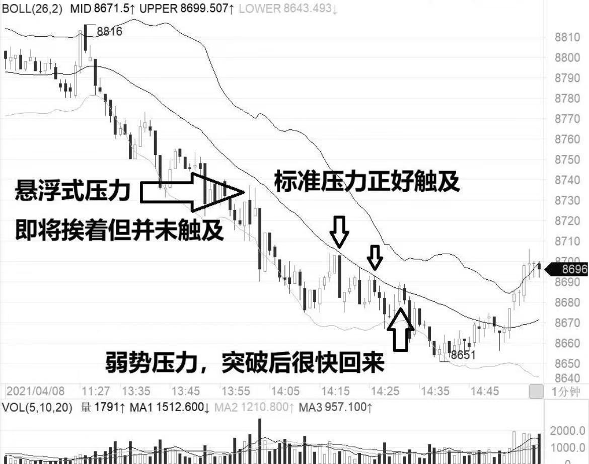 在价格下跌中途,K线的上影线距离布林线指标中轨线较近,但两者还有一些距离,这种压力现象其实是最强劲的悬浮式压力。其技术特征是两者看似将要相交但实际并未接触到。在价格下跌的过程中,压力位置越低,则空头迹象就越明显。所以,悬浮式压力其实是最强的压力现象,但这种走势却很难进行操作。K线的上影线与布林线指标中轨线并未相交,也就无法决策具体在哪个点位入场。