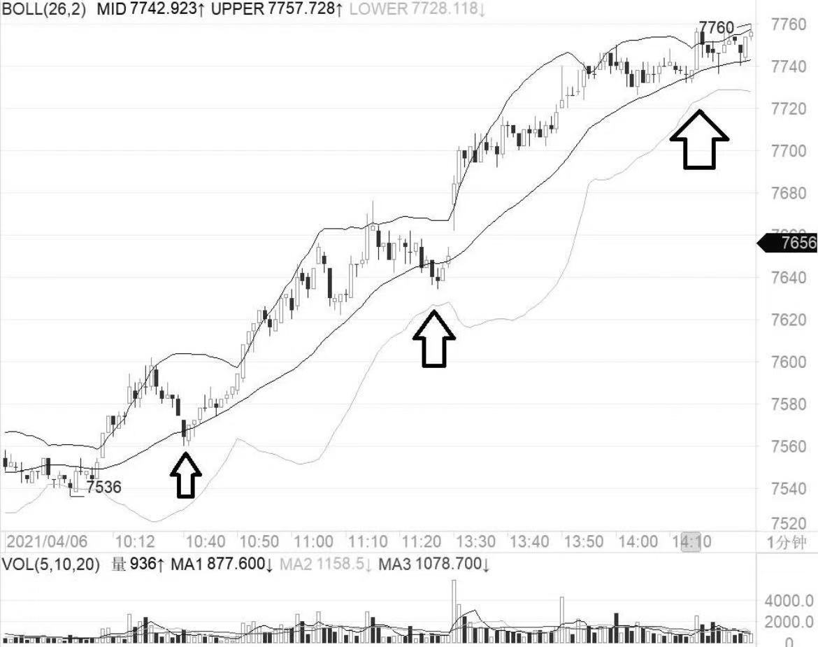 (1)上升趋势中看布林线指标中轨线或下轨线的支撑,若中轨线失守了也不要紧,只要下轨线能够撑住,多头形态就依然存在,价格仍然具有进一步上涨的潜力;但若下轨线的支撑失守了,那上升趋势就有可能被终结。