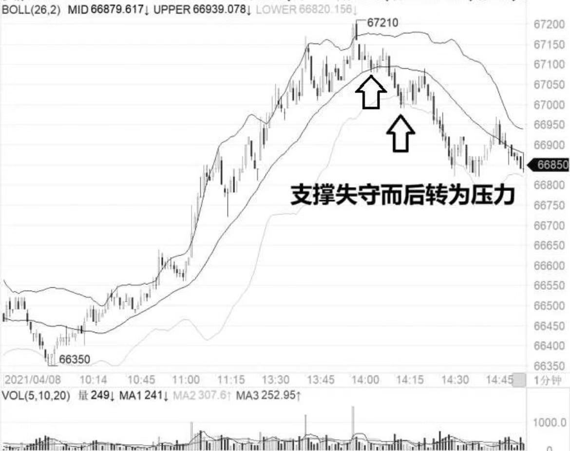 在第二个箭头处,价格向下击穿了下轨线。这是不好的现象,它意味着多头形态遭到了破坏,否则为什么之前中轨线能支撑住价格而下轨线却被跌破呢?所以,下轨线被跌破这个现象说明价格的波动性质被彻底地改变了。当支撑位被跌破之后,其会反转变成压力位,当价格反弹到中轨线时,中轨线便转为强大的压力并促使价格下跌。这就是支撑与压力的相互转换。