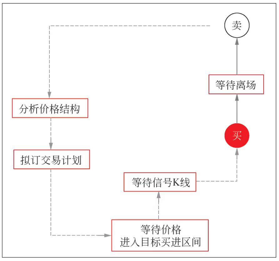 图1是裸K线交易法的交易循环图。左侧是“寻找机会”阶段;中间是“等待信号”阶段,一是等待价格进入目标买进区间,二是等待出现交易的信号K线;右侧是“执行交易”阶段。整个交易循环完成,重新开始下一轮交易循环。