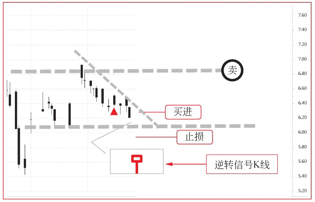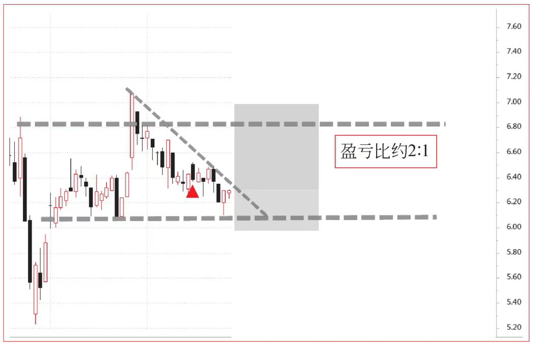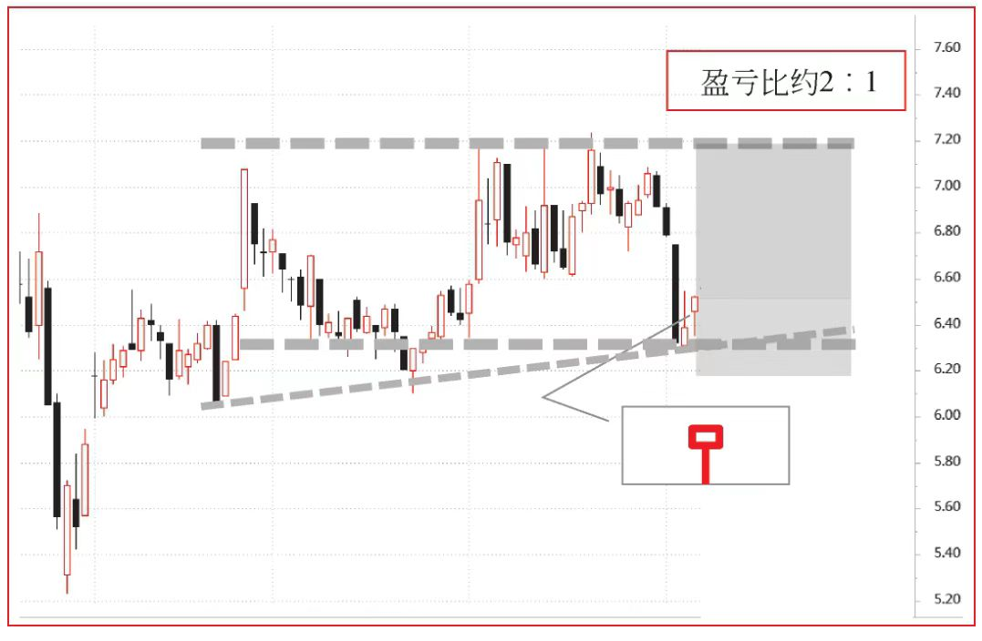 事实上,K线交易者的交易计划和执行会稍微复杂一点。在信号K线确定后,会根据进场位置进行盈亏比(Profit to Loss Ratio)分析。图6中的盈亏比约为2∶1,这是一次优良的交易机会。